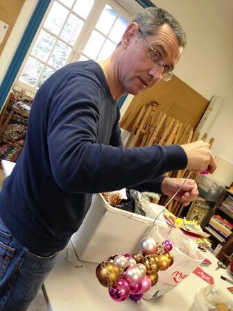 Stéphane se lance dans une couronne de boules de noël faite avec un simple cintre métallique.