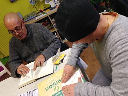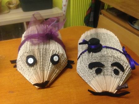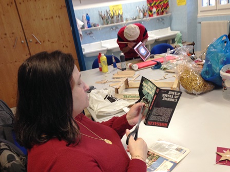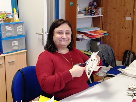 Régine, Eric et Annie ont choisi un travail de patience : pliage de magazine en sapin et de livre en hérisson.