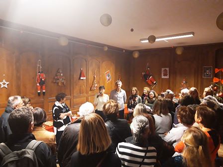 Juste après le mot de la présidente Anne Camitz, les bénévoles et élèves des ateliers d’espagnol entonnent un chant de Noël… en espagnol bien sûr. Bravo et félicitations à eux pour cette joyeuse initiative. Muchas gracias d’avoir si bien assuré et osé animer ce début de soirée.