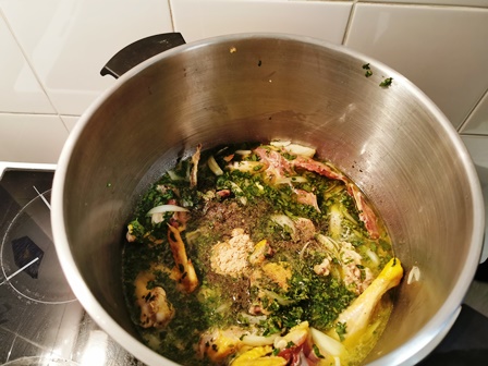 - Découper le poulet, le faire cuire avec un filet d’huile d’olive, un peu d’ail et du persil.