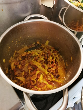 - Dans une autre casserole faire gonfler les raisins dans de l’eau chaude